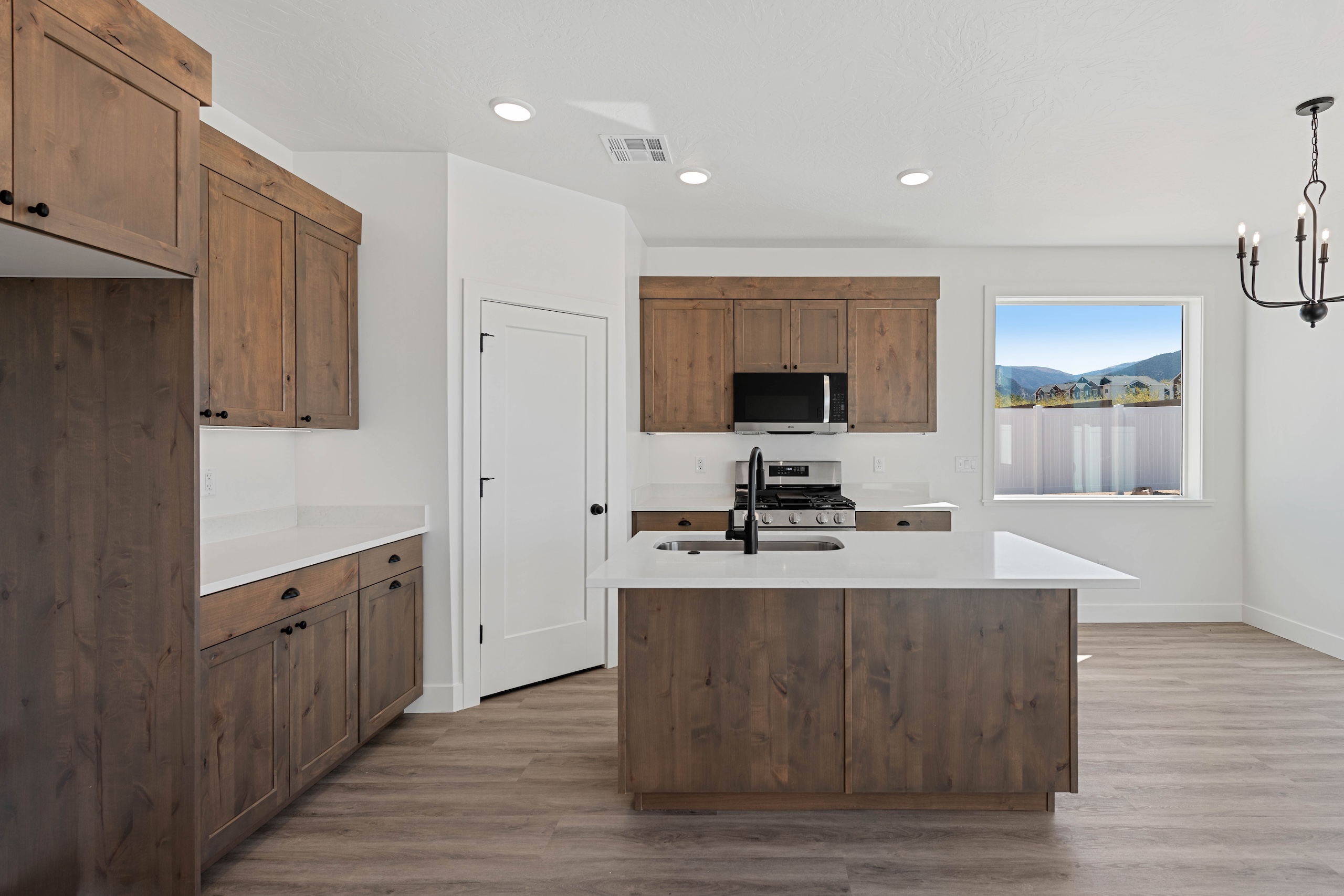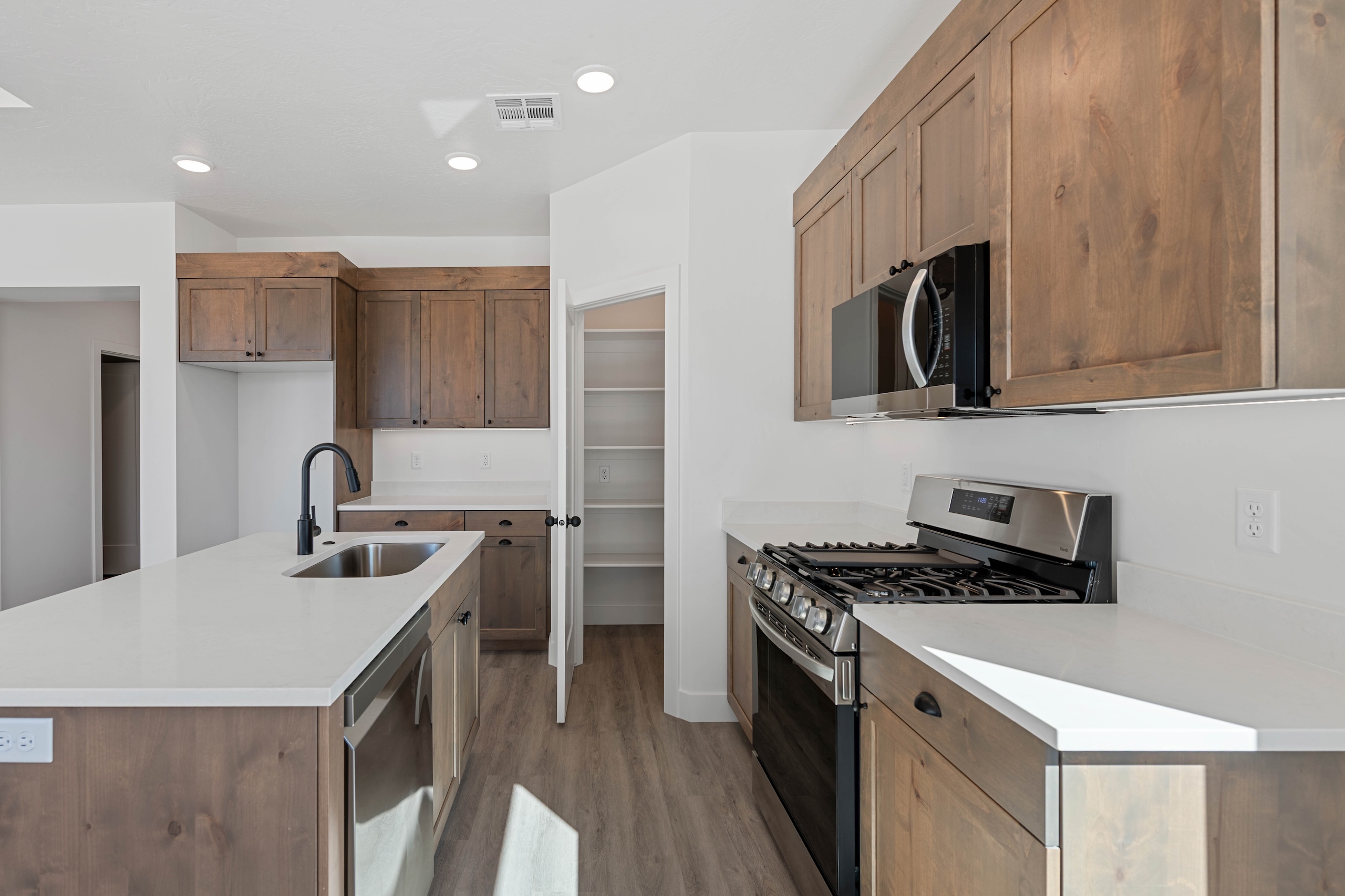 Ease of access is paramount, with laundry facilities located directly across the hall from the bedrooms, ensuring household chores are a breeze. The heart of the home opens up to an expansive open concept family room, dining area, and kitchen – perfect for gathering with loved ones. The L-shaped kitchen boasts a generous island with a built-in sink, perfect for meal preparations, and a large walk-in pantry for all your storage needs.